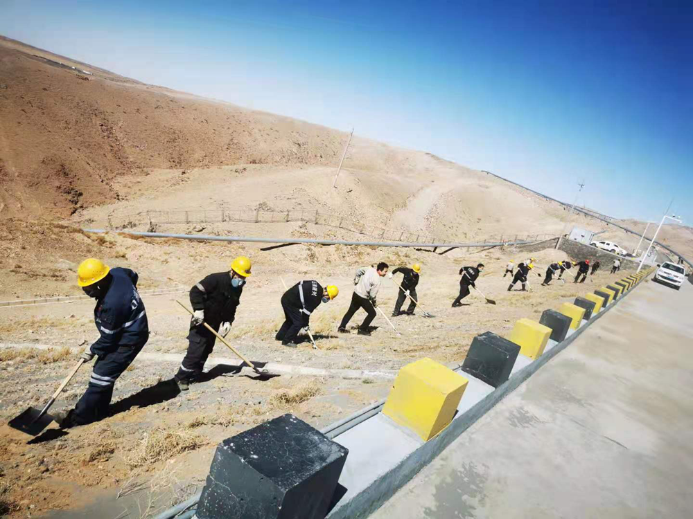 本次活動(dòng)重點(diǎn)對基礎(chǔ)壩兩側(cè)坡面進(jìn)行綜合治理,治理長度約1.5公里。面對坡陡、風(fēng)大、黃沙亂舞的工作環(huán)境,黨員干部不懼困難、以身作則、俯沖一線,帶頭撿拾垃圾、清理尾砂、覆土灑水以及對安全警示牌進(jìn)行維護(hù)保養(yǎng)。廣大職工緊跟其后,或一字排開,或矩陣展開,忙碌的身影遍布整個(gè)坡面,鏟車的轟鳴聲、鐵锨的吱吱聲與狂風(fēng)的呼嘯聲琴簫合奏,在藍(lán)天、斜陽和荒山的襯托下,勾勒出一幅“聲與色”、“動(dòng)與靜”相得益彰的勞動(dòng)生產(chǎn)畫卷。